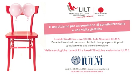 13.00 in Aula Seminari (IULM 1) si terrà un seminario di sensibilizzazione sul tema, organizzato dalla Lega Italiana per la Lotta contro i Tumori (LILT) di Milano nell'ambito della campagna "Nastro rosa". Nel corso di questo verranno distribuiti i coupon che le studentesse e le dipendenti IULM potranno utilizzare per sottoporsi gratuitamente alle visite senologiche che si effettueranno nella Sala visite della IULM 1 lunedì’ 21 e lunedì 28 ottobre.