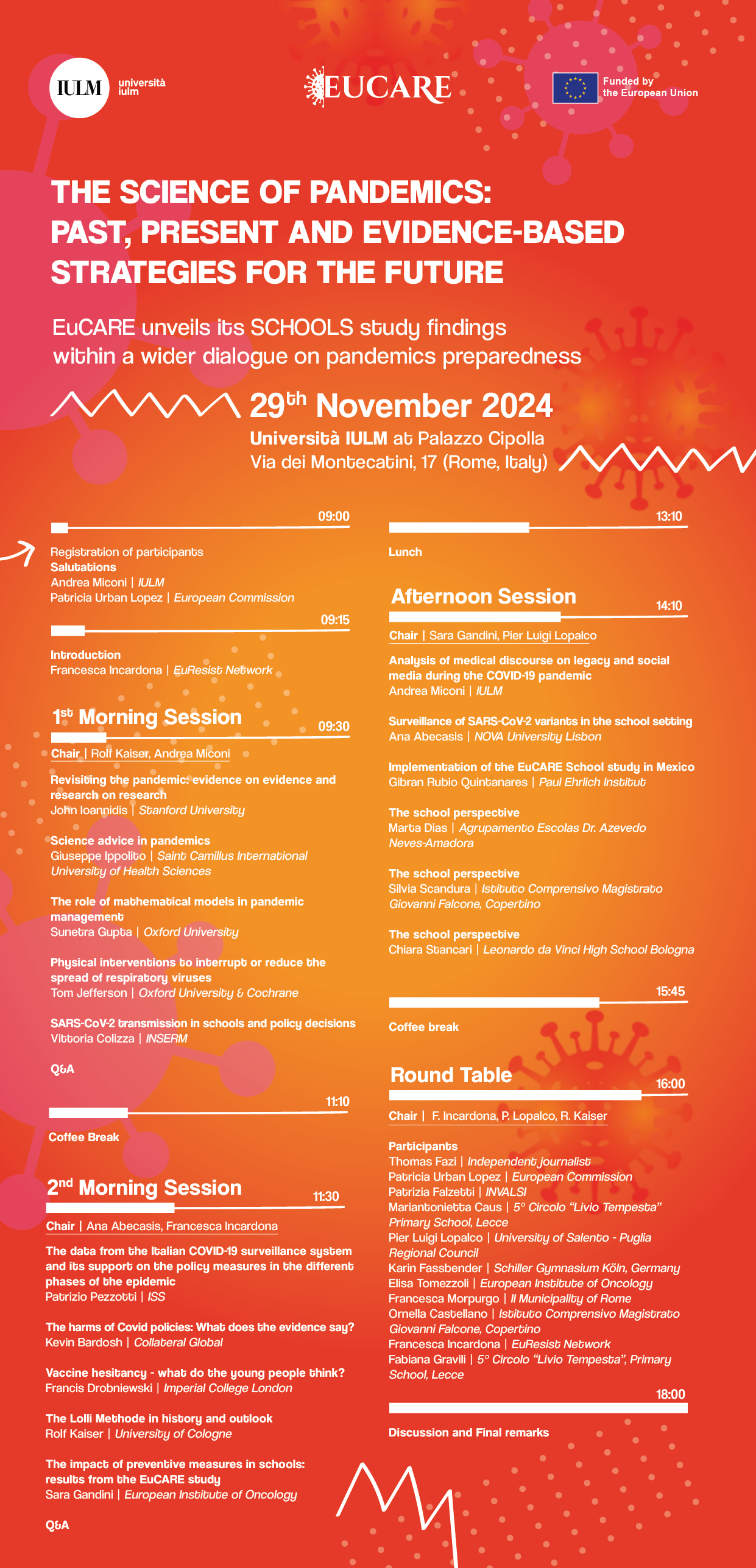 On 29 November 2024, in the IULM premises in Rome, IULM University and the Horizon Europe EuCARE project network present the results of the SCHOOLS study in a workshop dedicated to pandemic preparedness.