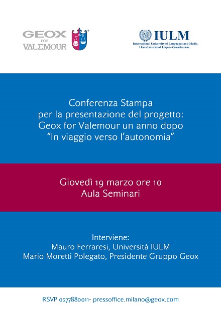 Si svolgerà giovedì 19 marzo, alle 10 in Aula Seminari, la presentazione del progetto “Geox for Valemour”, una collezione speciale realizzata da ragazzi diversamente abili ad un anno dal lancio del progetto. Durante l’incontro, promosso nell’ambito del Master in Management del Made in Italy, i vertici Geox illustreranno quanto realizzato in collaborazione con l'Associazione Valemour.