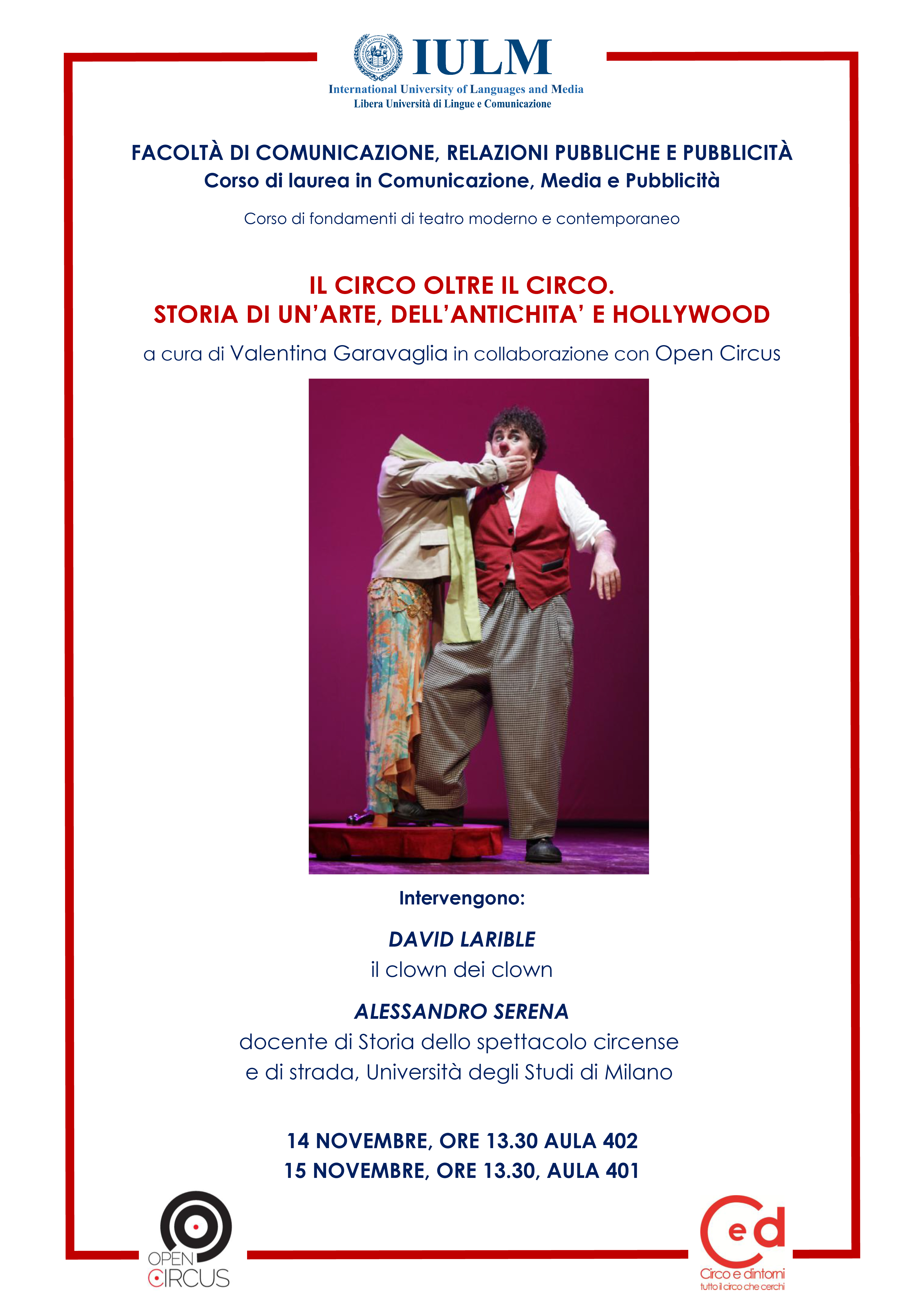 Gli eventi del 14 e 15 novembre, che si tengono nell'ambito del Corso di Fondamenti di Teatro moderno e contemporaneo della Professoressa Valentina Garavaglia, sono organizzati in collaborazione con Open Circus.