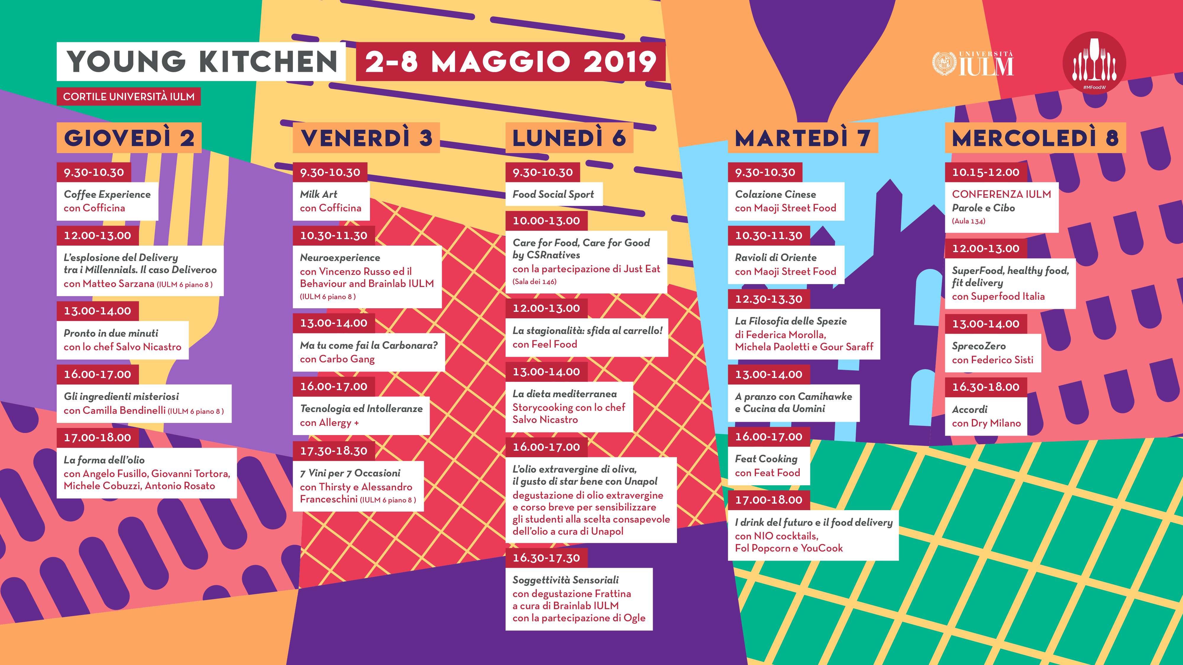 Il fulcro attorno al quale ruoteranno gli eventi sarà la Young Kitchen IULM, allestita nel cortile dell’Ateneo. Qui si svolgeranno degustazioni, laboratori e incontri enogastronomici alla presenza di chef e personalità del mondo del food. In parallelo a queste attività si terranno due conferenze: Care for Food, Care for Good il 6 maggio dalle 10.00 in Sala dei 146 e Parole & cibo l’8 maggio dalle 10.15 in Aula 134. Il filo rosso della manifestazione, coordinata dal Prof. Vincenzo Russo (Psicologia dei consumi e Neuromarketing) e organizzata con l’attiva collaborazione degli studenti del Master in Food and Wine Communication IULM, sarà “come consumare al meglio a prezzi ragionevoli”.