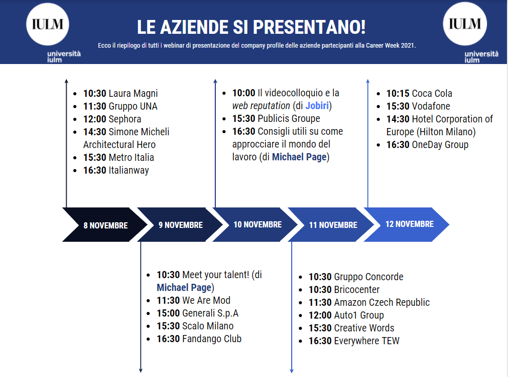 Nell’ambito della Career Week, alcune delle aziende partecipanti presenteranno il loro company profile dall’8 al 12 novembre.