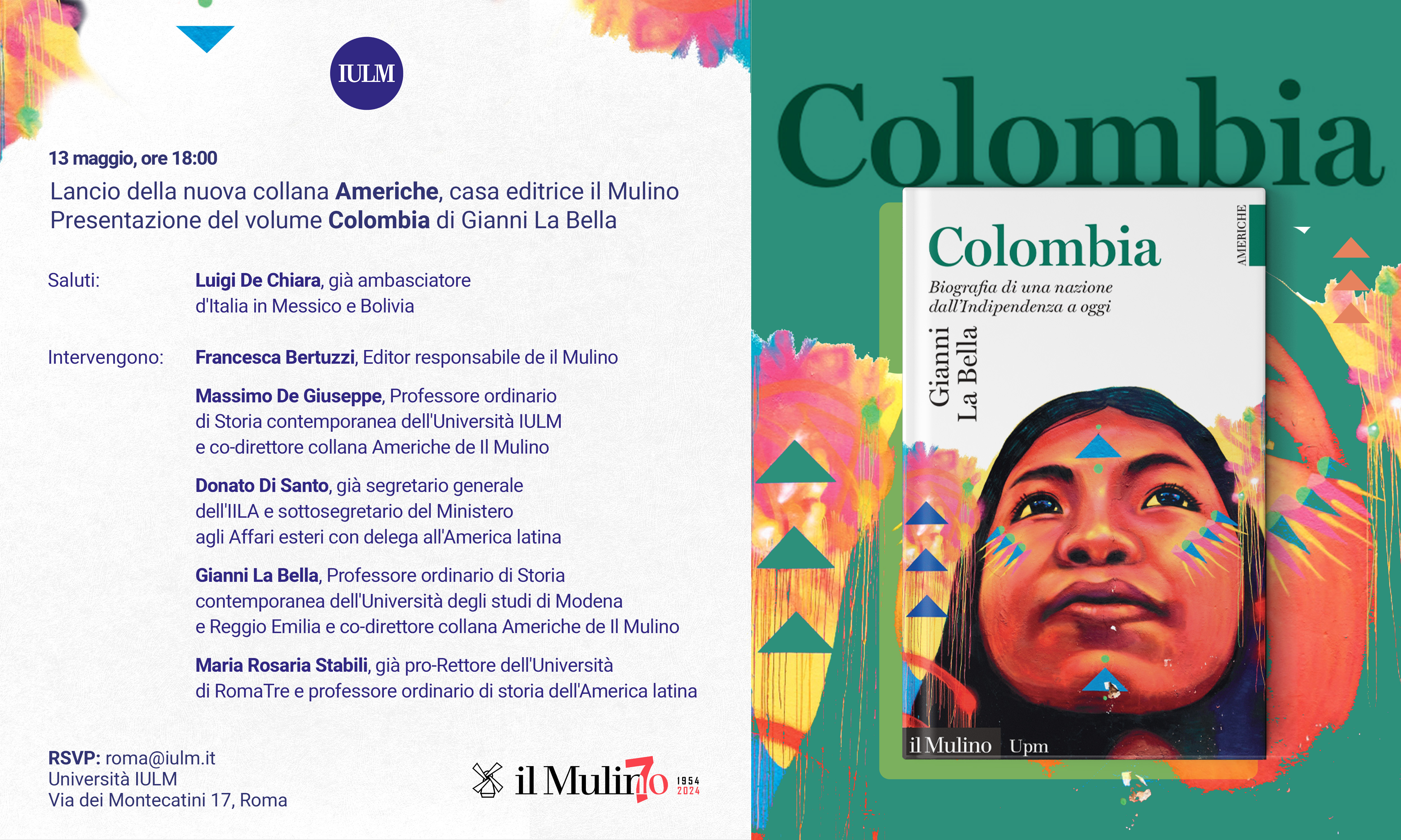 Il 13 maggio alle ore 18:00 presso la Sala eventi della sede di Roma della IULM (Via dei Montecatini 17) si terrà la presentazione del volume Colombia di Gianni La Bella. Il libro costituisce la prima uscita della nuova collana “Americhe” dell'editore il Mulino: l'idea è quella di offrire una serie di volumi, agili ma solidi, sulla storia contemporanea del continente, con uno sguardo che ci aiuti a comprendere le sfide del presente. Volumi di storia ma con una propensione al dialogo interdisciplinare che ci devono aiutare a cogliere intrecci e connessioni della contemporaneità.