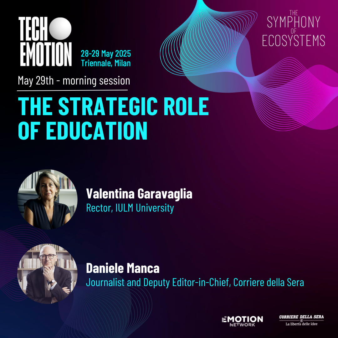 Strategic Role of Education” insieme a Daniele Manca, vicedirettore del Corriere della Sera e Direttore scientifico del Master in Giornalismo IULM, in occasione di TechEmotion Summit - The Symphony of Ecosystems in Triennale Milano.